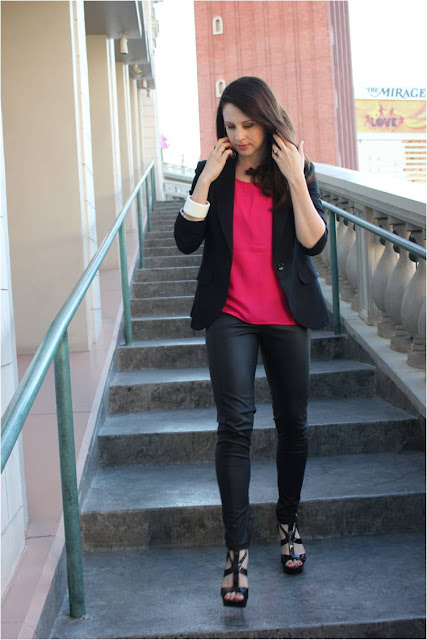 I picked up this hot pink top at Forever 21 on one of my numerous shopping trips while in Vegas. I think the pink really stands out against the black. I was pretty happy that I was able to build a quick (and cute) outfit that was weather appropriate.