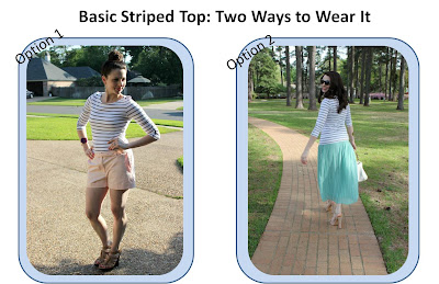 Yesterday I showed you two ways to wear a basic striped shirt with white (either shorts or pants). Today I am showing you two different ways that I have recently worn my shirt with pastels.